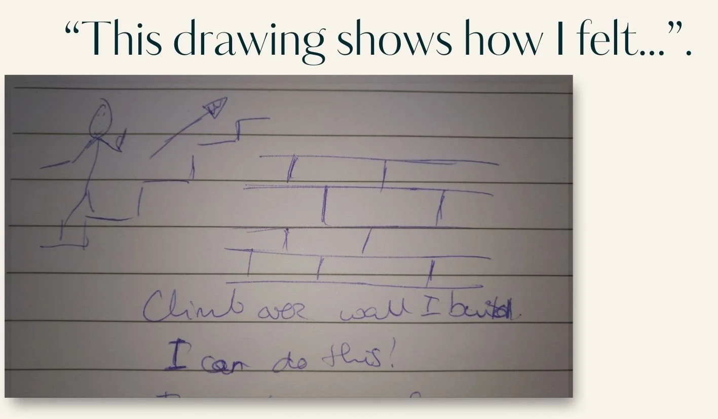 I made this drawing as a visual representation of my feelings, the wall I used to build inside of my own head symbolises how I was convincing myself that I am not good enough. During this Inner Journey a new belief came up for me 'It's safe to be myself', which brought me a sense of freedom and joy.”