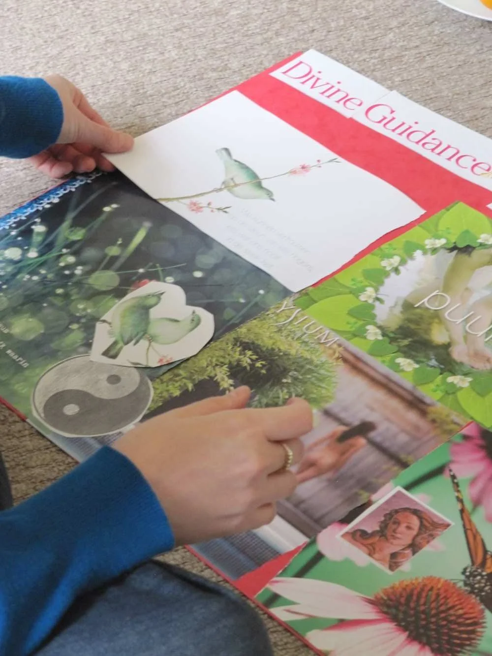 Today, Karin guided me through an analysis of my board and I was amazed.... I was not prepared for the depth of knowledge that my pretty collection of magazine clippings held! I learnt the significance of the placement of the pictures, and was encouraged to delve deeply into their importance. Karin’s incite and superb questions helped me uncover layers of understanding that were previously hidden deep below the surface. She gently helped me hold them up to the light and examine them.